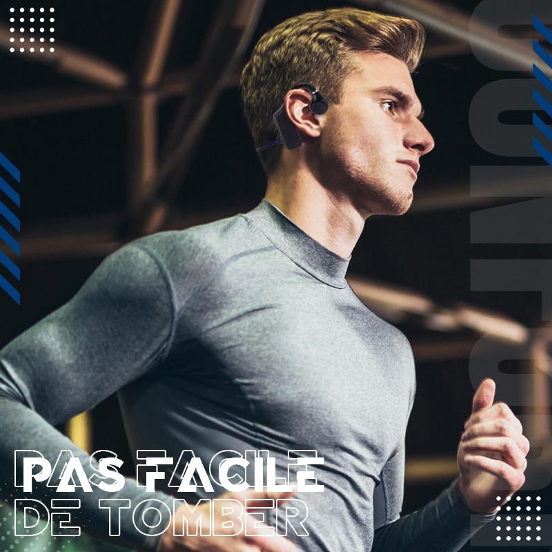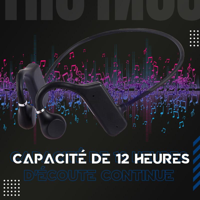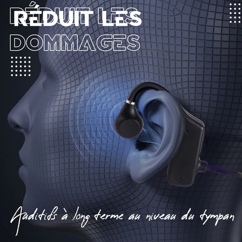 - Nos casques à conduction osseuse fonctionnent en vibrant et le son est transmis par les os à la cochlée, ce qui réduit les dommages auditifs à long terme au tympan par rapport aux casques ordinaires.
