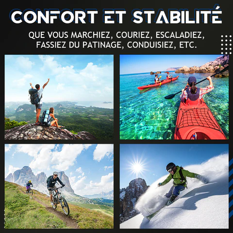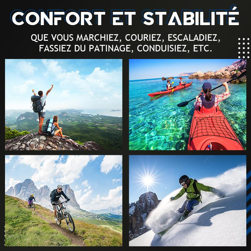 La conception ergonomique offre un confort maximal, que vous vous entraîniez intensément, que vous marchiez, couriez, escaladiez, fassiez du patinage, conduisiez, etc, ce qui vous permet de sauter sans tomber et de courir sans vous balancer. -